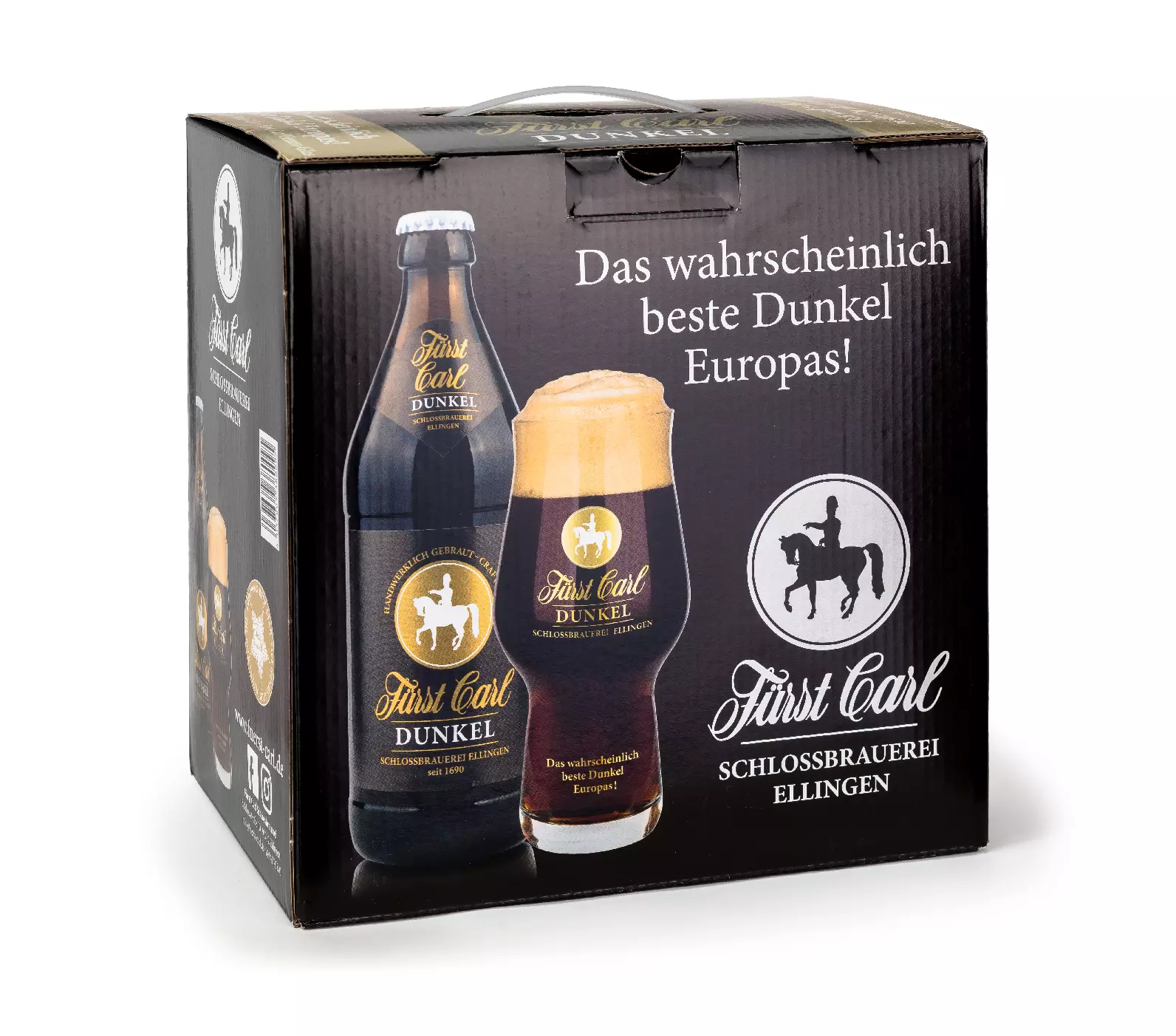 Ein hochwertiger Geschenkkarton gefüllt mit fünf Flaschen unseres Europameisters Fürst Carl Dunkel (0,5 l) und einem passenden Genuss-Glas. Das perfekte Präsent für alle Dunkelbier-Liebhaber – stilvoll, edel und bereit zum Verschenken.