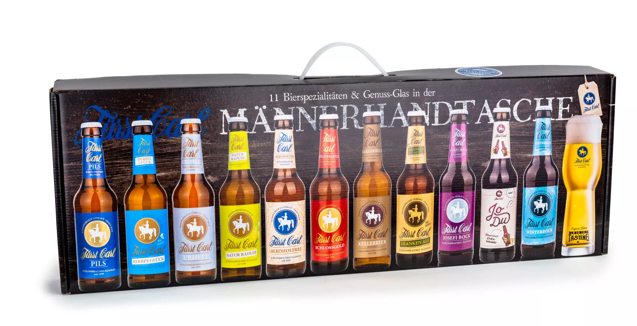 Die Fürst Carl Männerhandtasche ist das ultimative Geschenk für Bierliebhaber: 11 ausgewählte Bierspezialitäten aus der Schlossbrauerei Ellingen, kombiniert mit einem hochwertigen Genussglas. Perfekt zum Probieren, Verschenken oder selbst Genießen – stilvoll verpackt und bereit für jeden Anlass.
